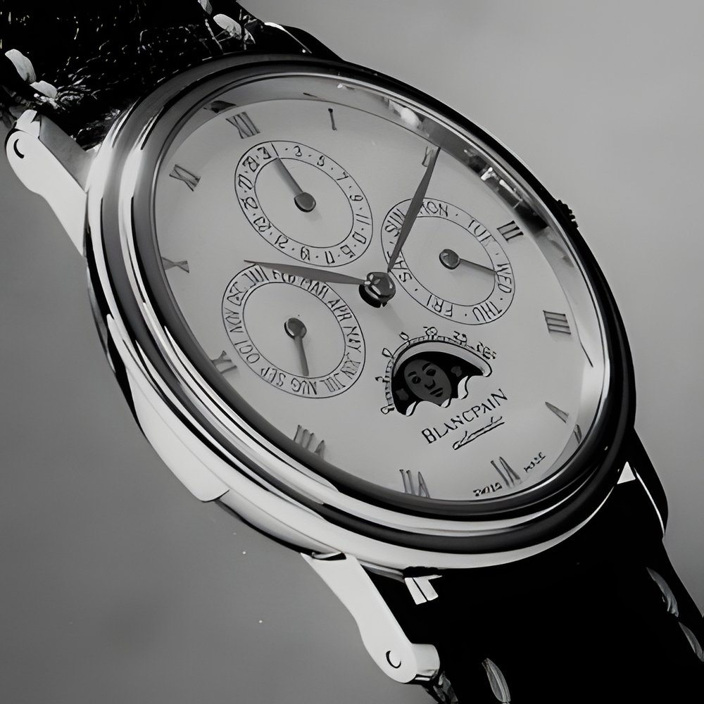 The Blancpain minute-repeater watch first introduced last year in Basle is back this year with a seifwinding mechanism - and a perpetual calendar ! The movement, only 4.4 mm thick, comprises over 600 components (+ screws). Only eight such watches, lovingly made by hand, will be produced this year. Case in 18K gold. (BLANCPAIN)