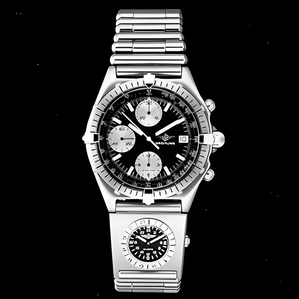 Introducing the “Navitimer Chronomat” pilot’s chronograph from Breitiing : selfwinding mechanical movement, hour and minute timers, case water-resistant to loo m with screw-lock crown, knurled bezel and sapphire crystal. A quartz “UTC Unit” (UIC = Universal Time Coordinated) is mounted on the bracelet. Featuring a dial with 24-hour divisions, it shows the time in another timezone. A smaller-diameter model for women, with handwound mechanical movement, is also available. (BREITLING "Navitimer Chronomat UW’)