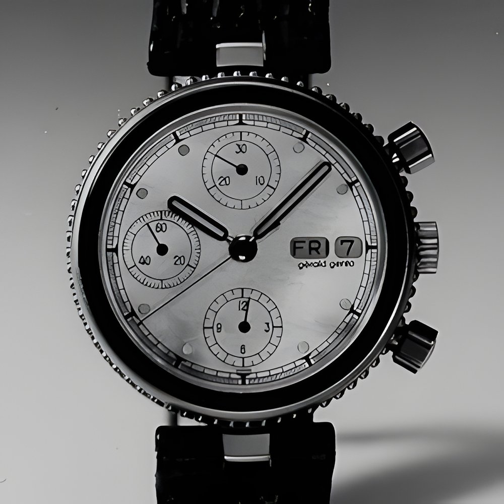 Latest entry in Grald Genta’s “Gefica” line, this water-resistant selfwinding chronograph is available with either bronze and steel or solid 18K gold case. A superbly appropriate sharkskin strap stresses its sporty spirit. Choice of mother-of-pearl, tortoiseshell, slate or opal-shaded dial. (GERALD GENTA)