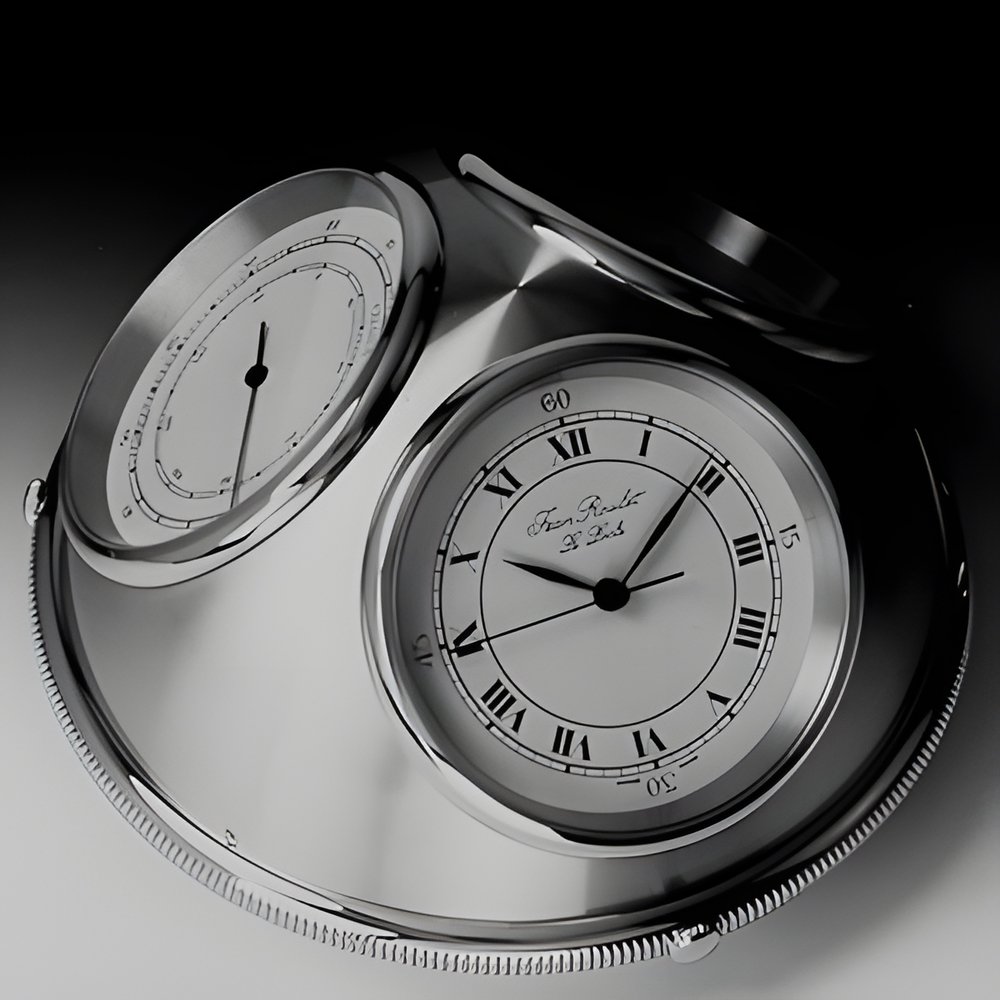 Designed like a space-age device, this multi-instrument table station features a quartz clock, a barometer and a thermometer mounted on a ball-bearing equipped pivoting base (Ø 160 mm). 18K goldplated brass case. (JEAN ROULET)