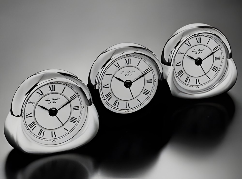 Called “Berry” after the old French province of that name, these compact little alarm clocks have a solid brass case with gilt bezel and a gilt, silvered or oxidized black base. Jean Roulet proprietary quartz movement. (JEAN ROULET “Berry”)
