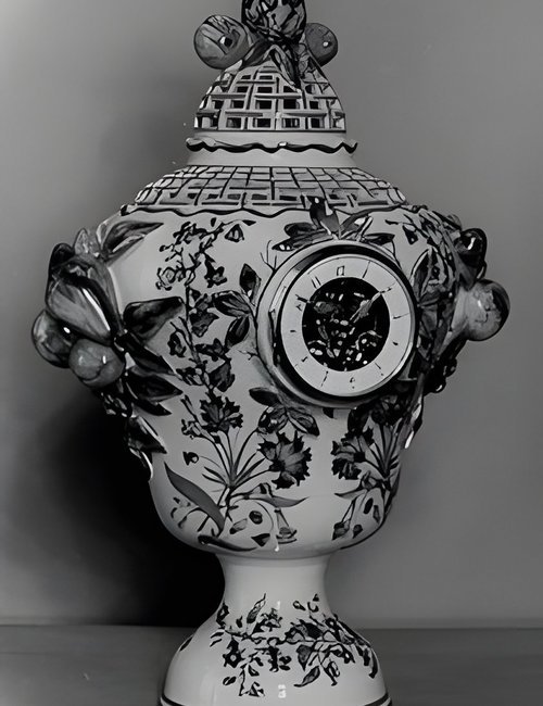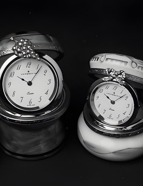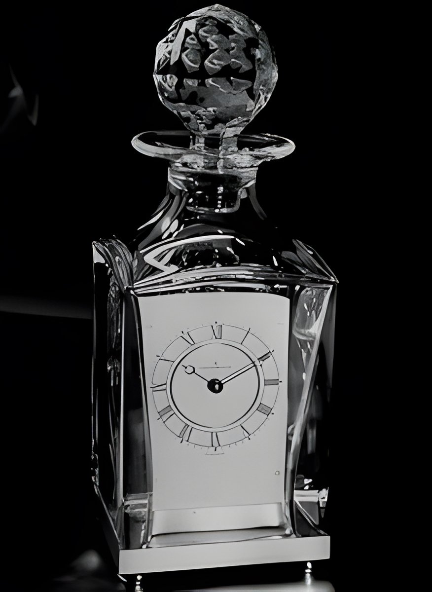 This decanter with facetted stopper in Saint-Louis crystal contains not a drop of fine cognac. Instead, it holds a quality 8-day movement. It comes with a metal base with round, gilded and lacquered feet. An exclusive design from the master clockmaker LAUGEROTTE.