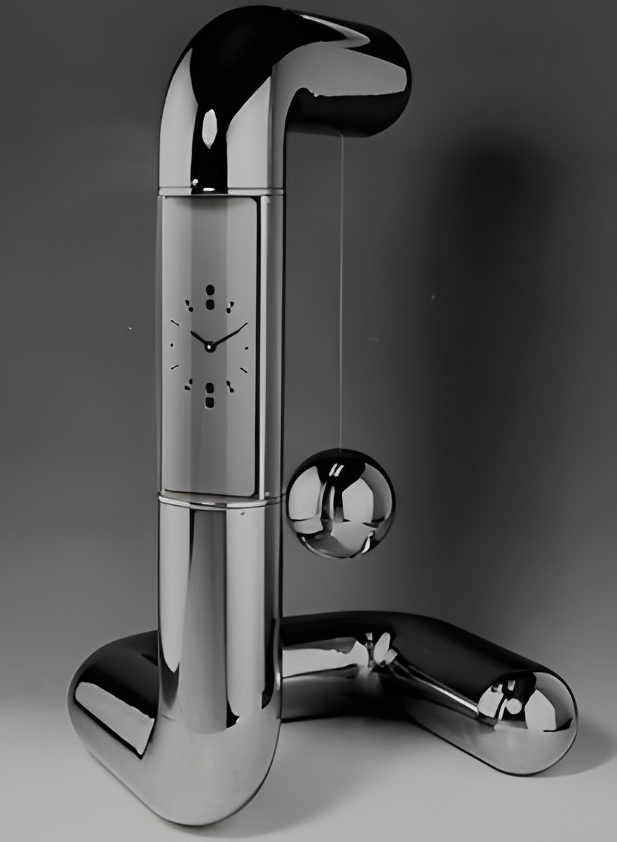 This truly original table clock embodies a striking combination of contemporary design and the ciockmaker’s art. It features a weightdriven mechanical 8-day movement and its case is 18K gilt solid brass (60 cm high) - an Eddy Schoepfer design for Jean Roulet, Le Lode. Production is strictly limited to ten individually numbered models. (JEAN ROULET)
