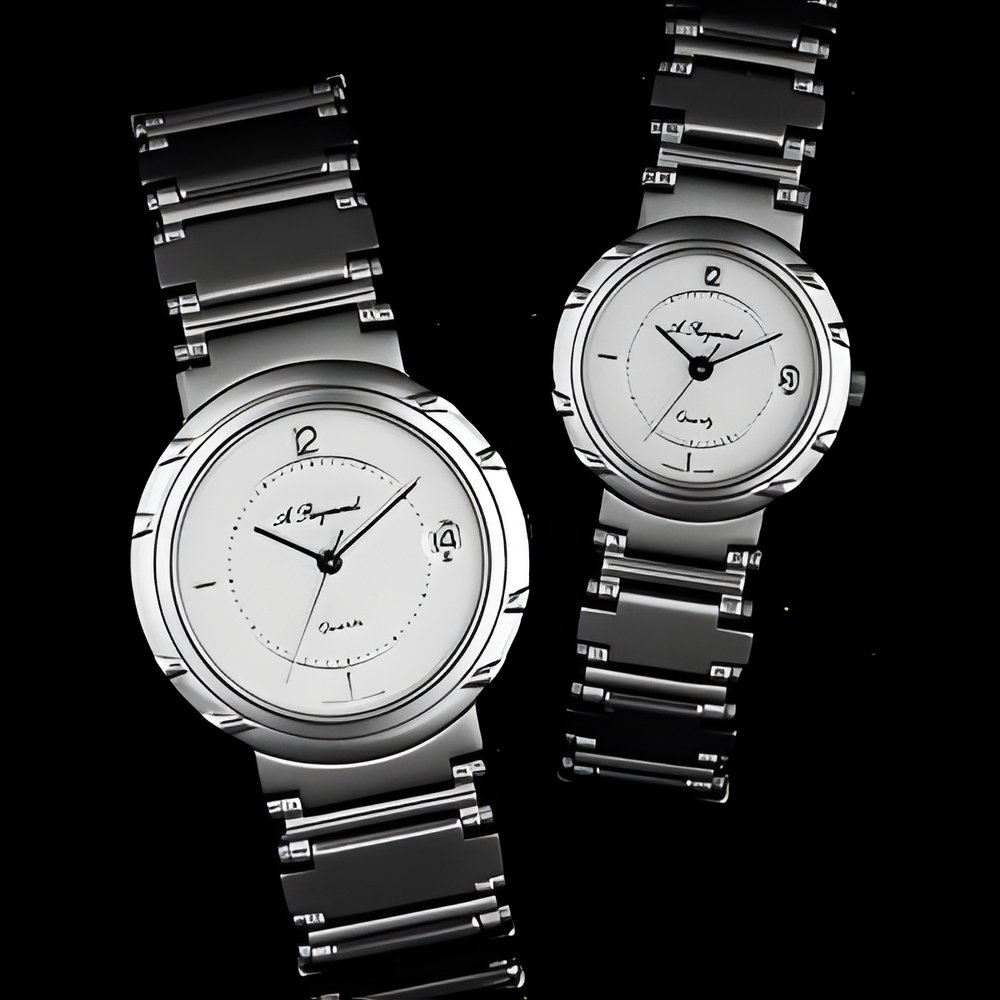 Nothing seems to affect the popularity of “His and Hers” watches. This stylish, sports-spirited pair, water-resistant to 30 m, displays two-tone allure : steel with goldplated bezel and bracelet links. Very thin ETA quartz movement with centre seconds and calendar. (3. CHOFFAT S.A. - A. REYMOND)
