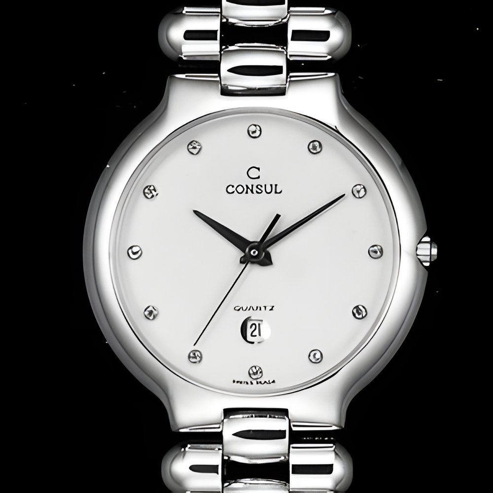 Matching quality and styling flair to perfection, this Consul quartz watch is water-resistant to 30 m. Both case and bracelet are finished in 18K goldplate. (CONSUL “Masterline”)