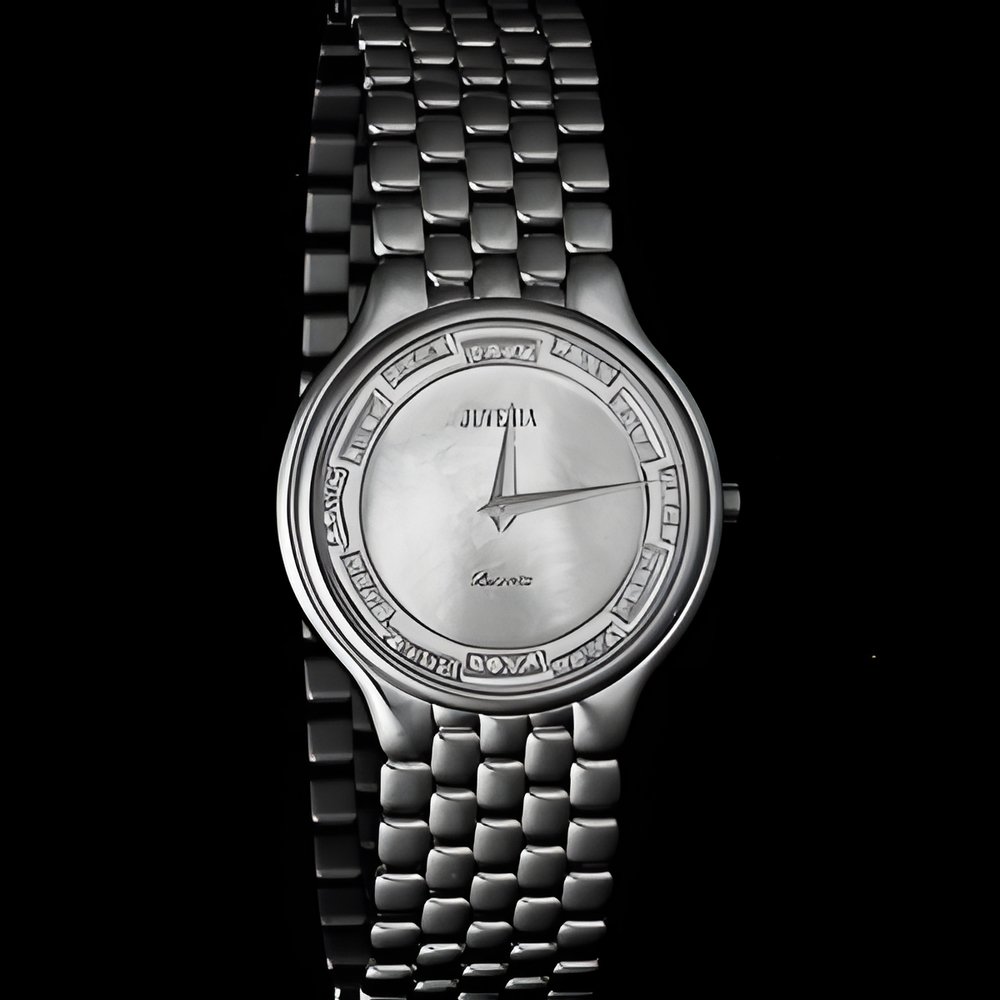 From Juvenia’s new “Biarritz” collection comes this design with a particularly supple, wrist-hugging bracelet flawlessly integrated into a water-resistant case. Gold dial with mother-of-pearl inlay and finely chased decor enhanced with diamonds. In 18K yellow gold. (JUVENIA “Biarritz”)
