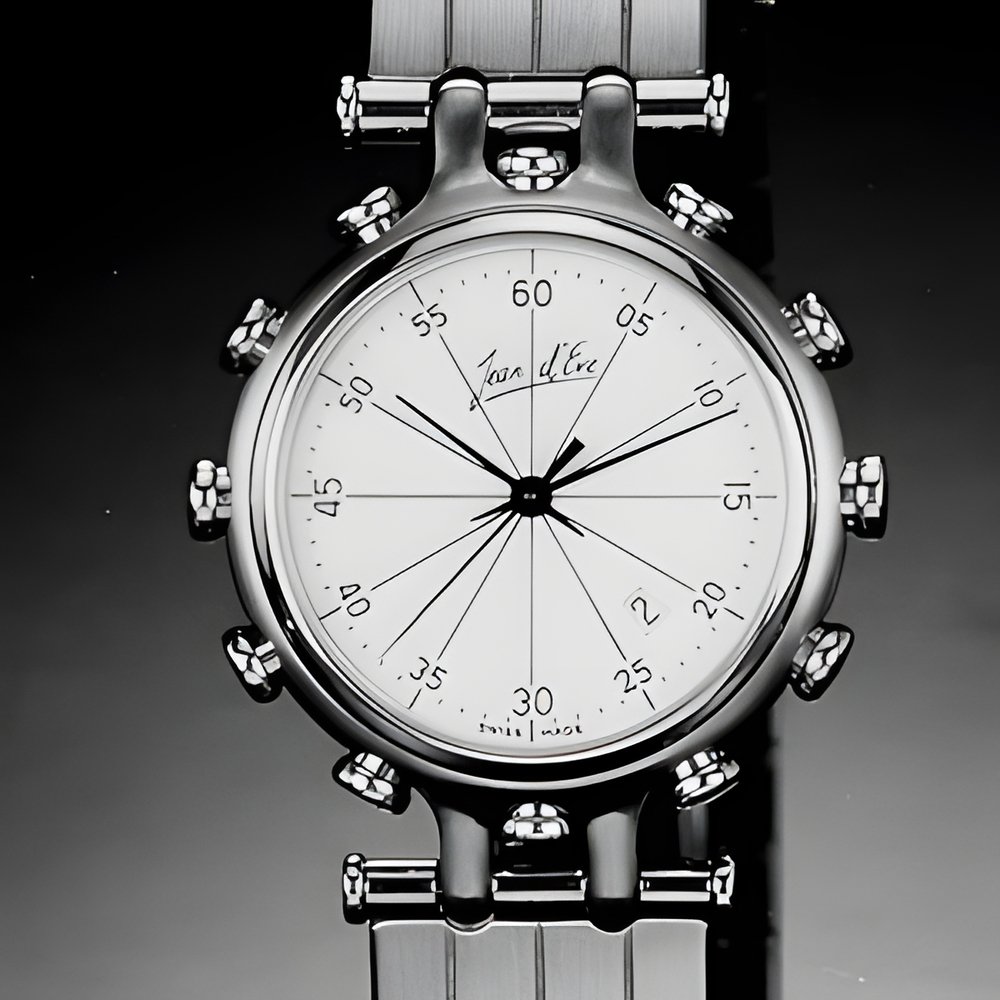 Designed for sailors and sportsmen, Jean d’Eve’s “Golden Race” model is patterned on a ship’s wheel, one handle of which features the setting crown. Its steel - or steel and gold - case, water-resistant to 50 m, is fitted with two loops for the bracelet. Quartz movement with calendar. (LE PHARE-JEAN D’EVE “Golden Race”)