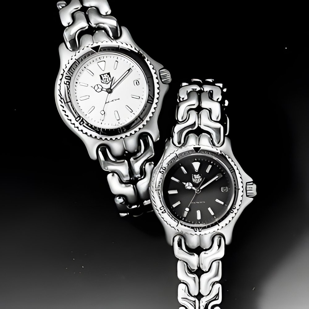 These TAG-Heuer sports watches, with exclusive eye-catching styling, come in three sizes. They feature a case water-resistant to 200 m with unidirectional turning bezel, a new screw-lock crown design and a sapphire crystal. The round-angled case and bracelet unit is available in stainless steel or with two-tone, goidpiate or black and gold finish. (TAG-HEUER “Sel - Sports Elegance”)