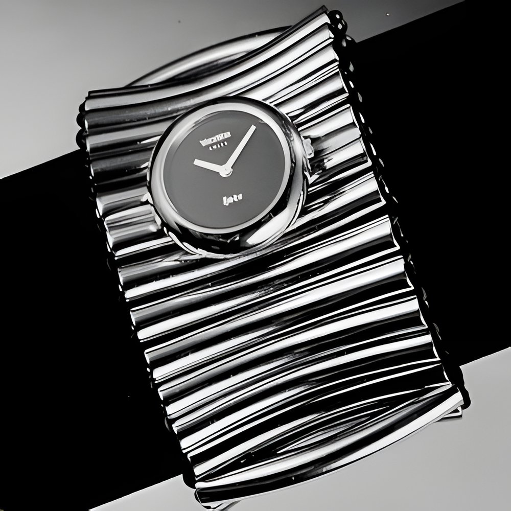 Attractively priced new models in goldplate join the “WatchWork” collection created by the Swiss designer Matto. Their ingenious clasp system allows them to be fitted in a variety of bracelets or goldplated rubber stands, modellable at will. ETA Swiss Quartz movement. Waterresistant down to 30 m. Shown here is a “double face” design. (G of T/D Watch Ltd. - “WatchWork”)