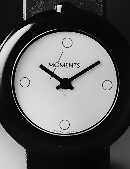 “Moments” - a new approach and a new product, offering contrasts in materials and colours between the watch’s various components : a satin band, for instance, contrasting with a synthetic case. Some models display the opposite like subtle convergences between “caviar” bracelet and a dial with “caviar” egg hour markers. An astute patented system allows instant bracelet changes, a wide variety of which is available in a choice of trendy colours. (MOMENTS - Arode Distribution S.A., Geneva)
