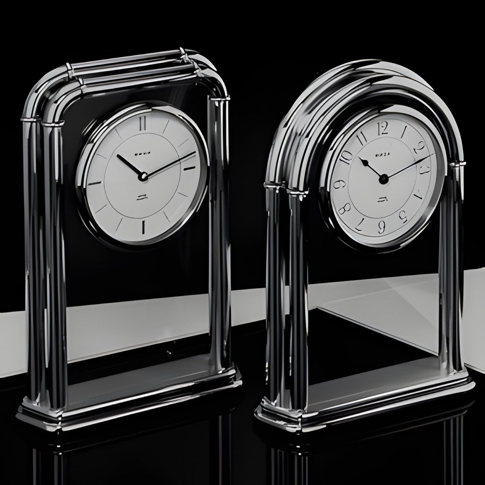 At the 1988 European Watch, Clock and Jewellery Fair, Swiza presents two large table clocks (156 x 220 mm) from its “Les Arcades” collection. They display graceful, elegant lines : solid brass, nickel-plated, varnished frames setting off mineral-glass faces. Swiss Made quartz movements, with optional alarm mechanism. Can be personalized by engraving on the glass face. (SWIZA “Les Arcades”)