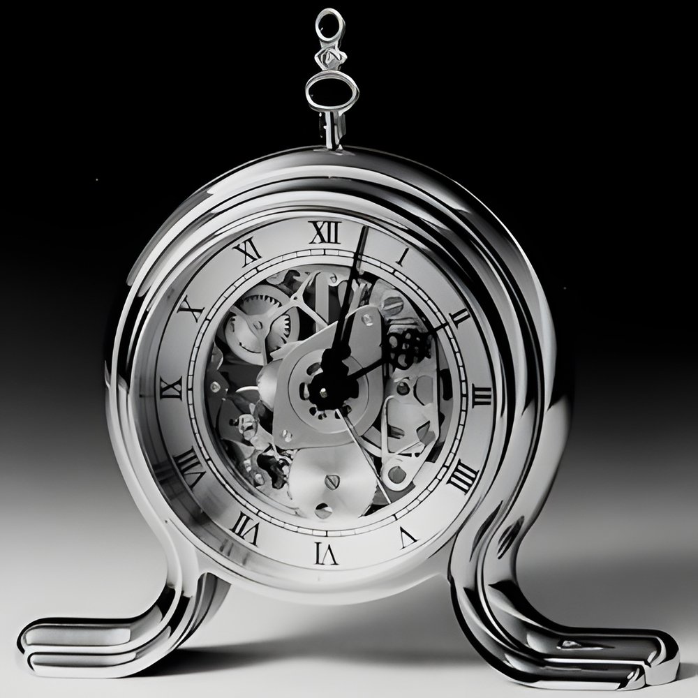 Handsome gilt-metal table clock with 8-day “skeleton” movement with gong alarm, openworked and engine-turned entirely by hand. Individually numbered limited (50 clocks in all) edition. (LUXOR, Le Locle)