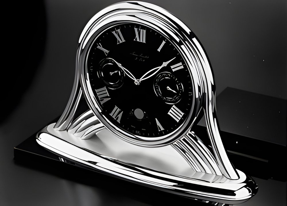 This Jean Roulet table clock’s generous proportions (230 x 160 mm) are composed of sleek flowing lines enhanced by a series of ring-like circles framing the dial inscribed with Roman numerals. Its calendar shows the day, the date and the phases of the moon. Jean Roulet quartz movement. (JEAN ROULET “Mirande”)