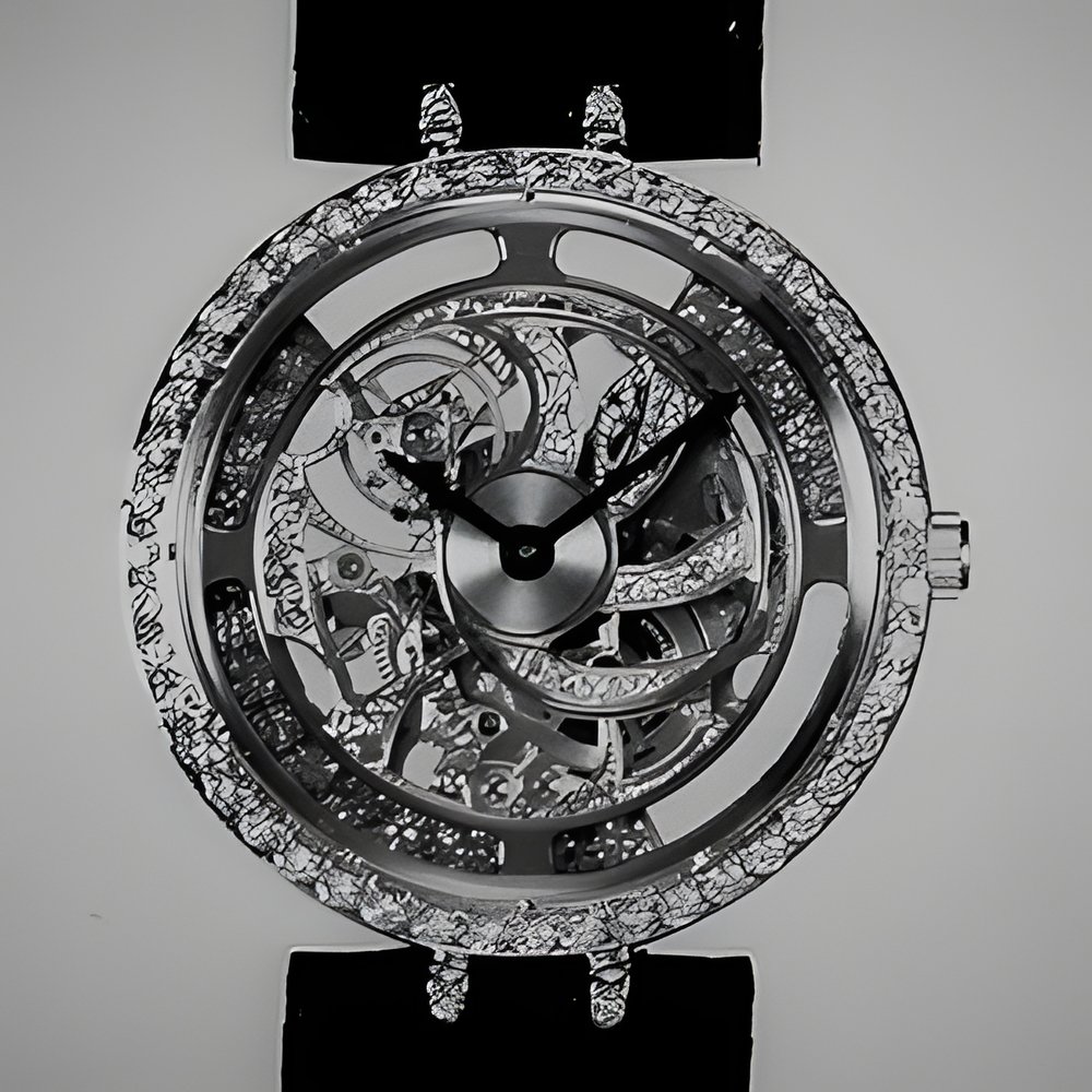 Sarcar’s “Magic Moon” exerts its captivating magic with every movement of the wrist. On the watch face, an openworked white gold motif rotates freely under the watch hands while around its openworked, seifwinding movement turns the latter’s diamond-studded rotor. 18K yellow gold case with diamond-set bezel and scratch-resistant, transparent sapphire back. (SARCAR “Magic Moon”)