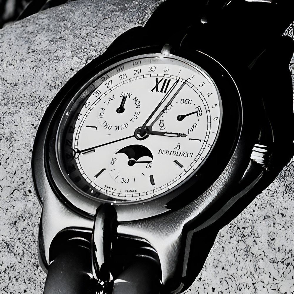 “Oldtimer” - an elegantly styled wristwatch with “complete” calendar and moon-phase indicator. Perfect as a leisure and dress watch, it is available in steel, steel and gold or in solid 18K gold. (BERTOLUCCI “Oldtimer”)