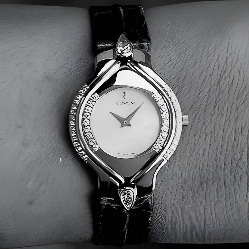 “Soirs” by Corum : a solid gold jewellery design with ¿4-8 brilliant-cut diamonds and two diamonds “tears” on the attachments of the blue or red croco bracelet. Dial in genuine mother-of-pearl. (CORUM)