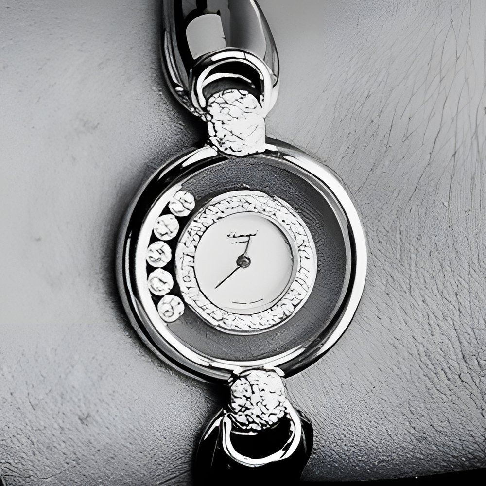 A newcomer to the “Happy Diamonds” collection. This 18K yellow gold jewellery watch features a rigid two-part bracelet, each of which pivots on a diamond-studded attachment. A diamond set bezel frames the dial around which five diamonds move freely in a sapphire “cage”. Mini-quartz movement. (CHOPARD GENEVE “Happy Diamonds”)