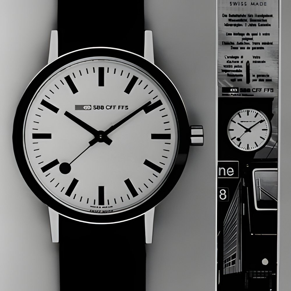 The official Swiss Railways clock on the wrist Pictured at left : one of the variants of Mondaine’s new ft-Watch with the familiar dial face and the red-dot semaphore arm centre second hand typical of the Swiss Railways station clocks. At centre is the original packaging designed for the Swiss Railways’ successful punctuality campaign. Thanks to the container-system, this water-resistant watch, which won a design award, comes in a wide variety of models, with a choice of cases and dials. At right the detail of the system : case, container (replaceable, if need be, in one minute) and the battery, easily inserted by the wearer himself. Swiss Made. (MONDAINE WATCH Ltd. - “M-Watch”)