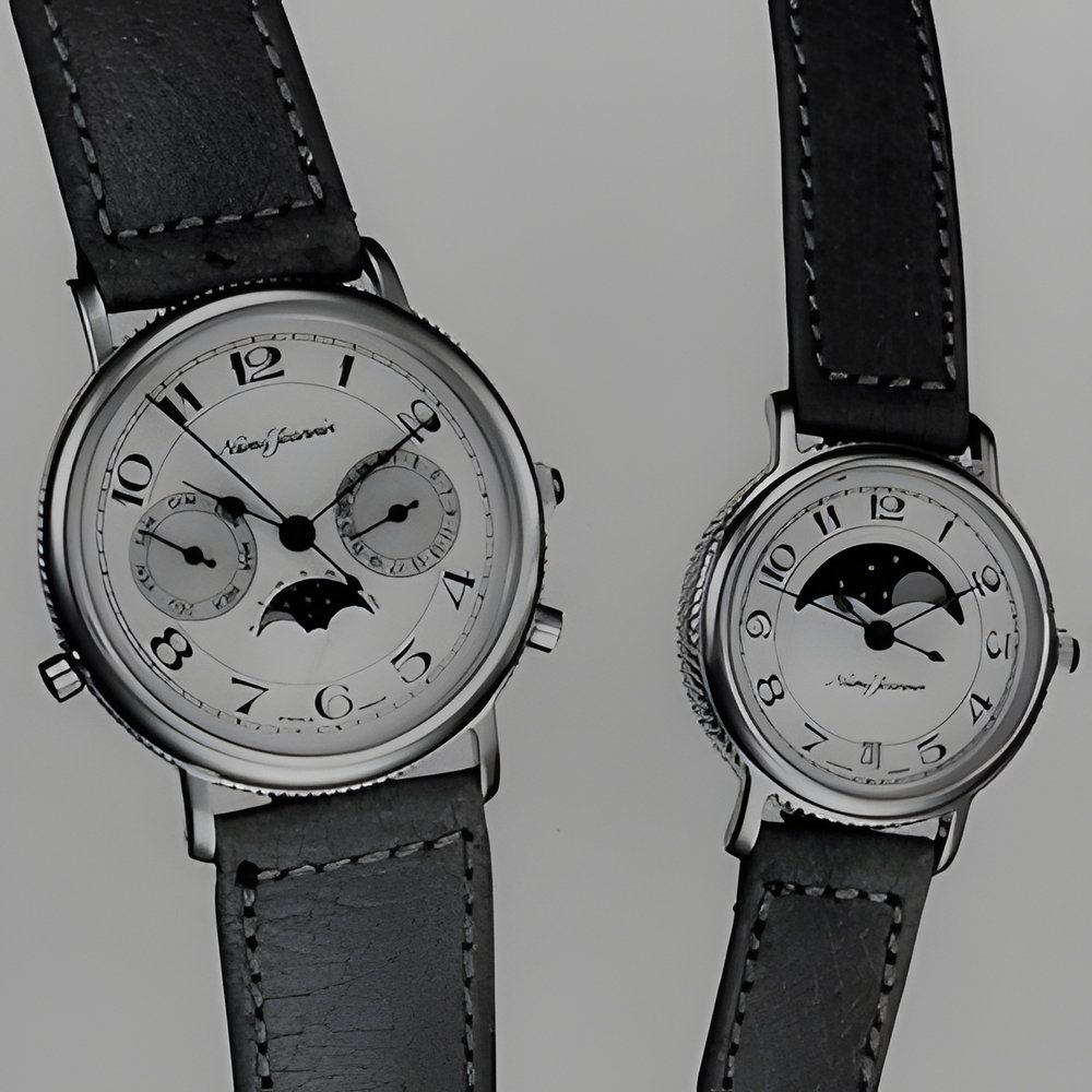 The original design of these so-called “coin” watches, with fluted case middle, goes back to the 1925-1930 period. Today, they come with extra-thin quartz movements featuring either a large moon-phase indicator or a double circular calendar for day and date plus a moon-phase indicator. 10-micron goidpiated, water-resistant case. (NUMA JEANNIN “Les Nostalgiques”)