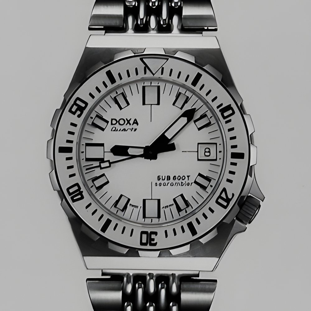 This Doxa “SUB 600 Lm Diver’s” is designed for underwater sports enthusiasts as well as for professional divers. Tested at depths of 600 m, it features a unidirectional ratcheted turning bezel and a screw-lock crown. Extremely rugged yet handsomely styled, it is fitted with a particularly reliable quartz movement. With steel expansion band.