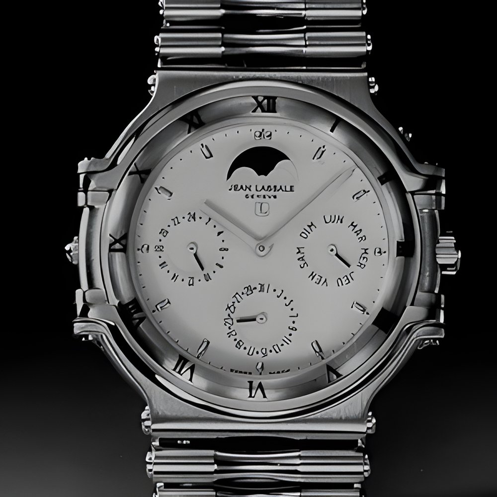 Thalassa Five Star - a stylish sports-spirited design from the Jean Lassale Collection. Quartz movement providing the time, second time-zone and moonphase indications along with the day and date. 18K gold or two-tone case water-resistant to 30 m, sapphire crystal, choice of white or blue dial. (JEAN LASSALE)