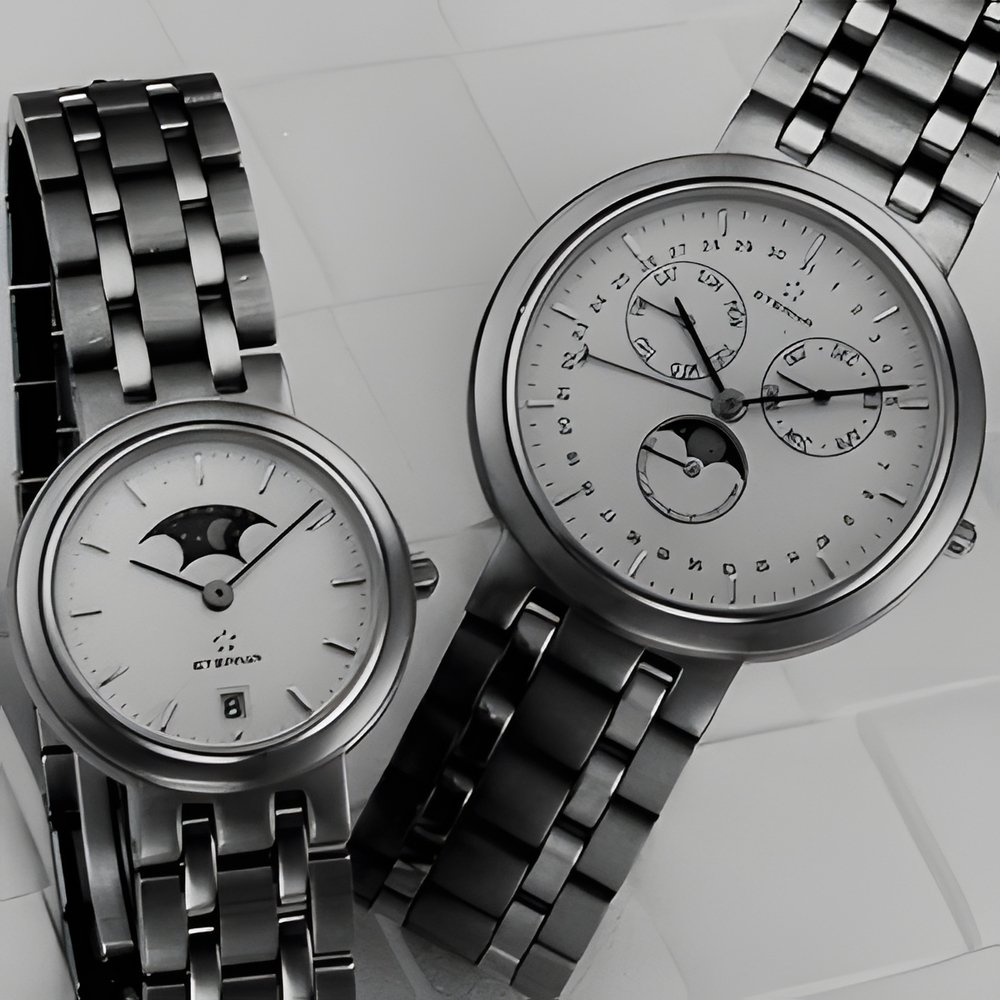[tema’s “St-Honoré” collection includes two “multifunction” models - one for men, one for women. The first features analogue hour, minute, second, date, day and month indications plus a moon-phase window. The second provides hours, minutes, date and moon phases. Both are ultra-slim designs in steel or with two-tone or goldplate finish, water-resistant down to 30 m. Quartz movements. With scratch-resistant sapphire or outcurved tempered mineralglass crystal. Internationally registered models. (ETERNA “St-Honoré II”)