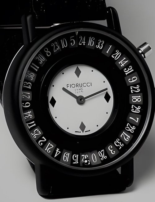 For the first time ever, a roulette game has been built right into a wristwatch. Its patented “Roulette” system comprising over 30 different parts is hand-assembled around the watch’s quartz movement. A press on the pushpiece actions the ball-bearing-mounted, 37-number ring’s rotation. Swiss made, water-resistant to 30 m, available with goldplate or matt finish. Fiorucci Time’s “Roulette” was awarded the “1987 Frontier Marketing Award”. ( FIORUCCI-TI:ME “Roulette”)
