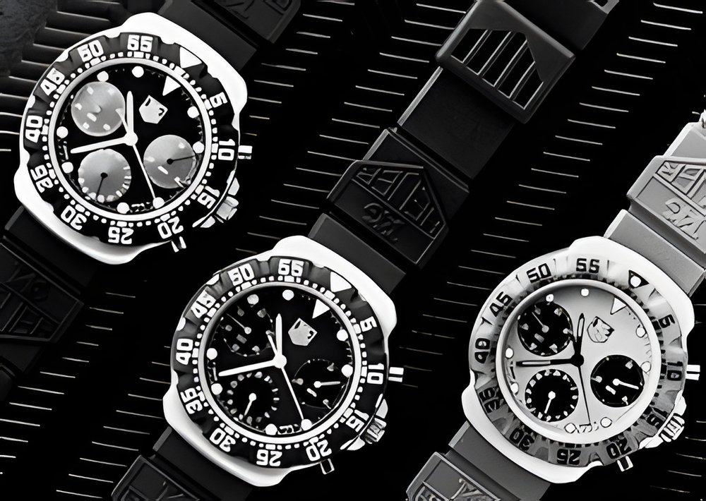 This attractively priced quartz chronograph rounds out TAG Heuer’s “Formula 1” line. Available in a variety of trendy colour combinations, it features a steel case water-resistant to loo m with a one-way rotating bezel in tinted fibreglass. With seconds timer, 30-minute totalizer, permanent small seconds and date. (TAG HEUER)