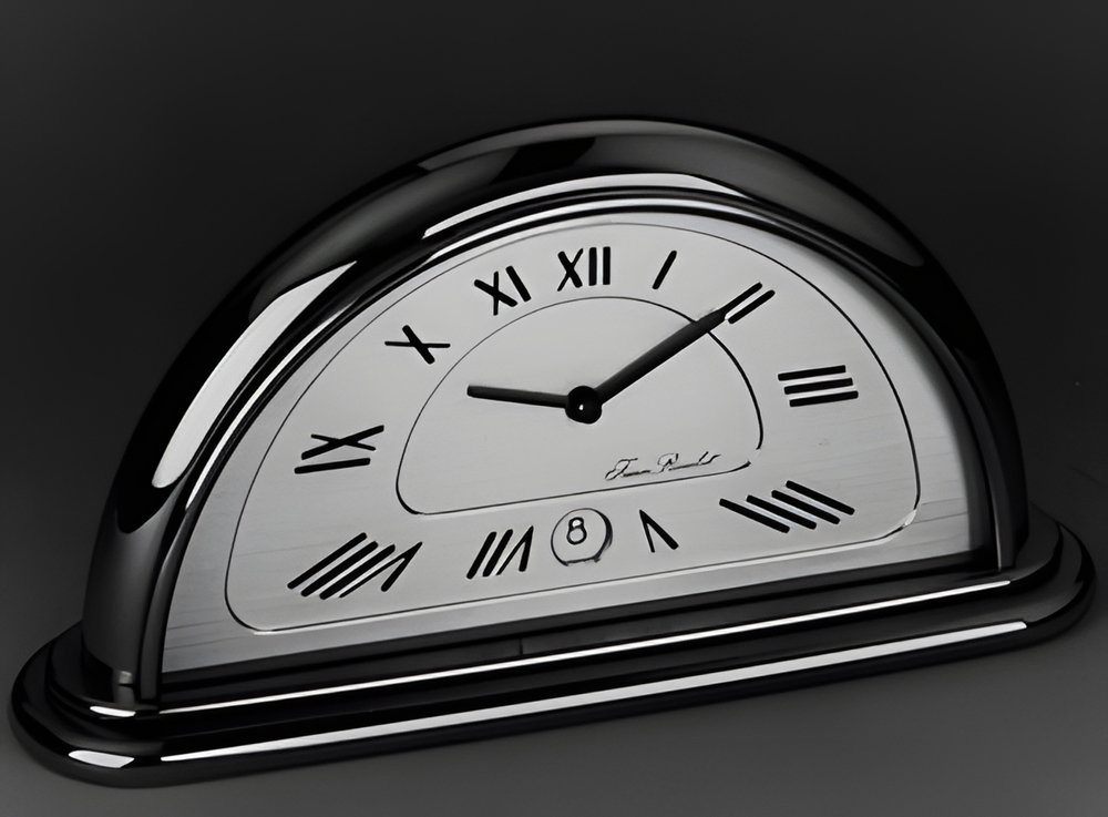 Pendulette en forme de demi-lune en laiton massif, doré au titre 18 ct et poli. Mouvement quartz avec date. (JEAN ROULET “Challenger”)