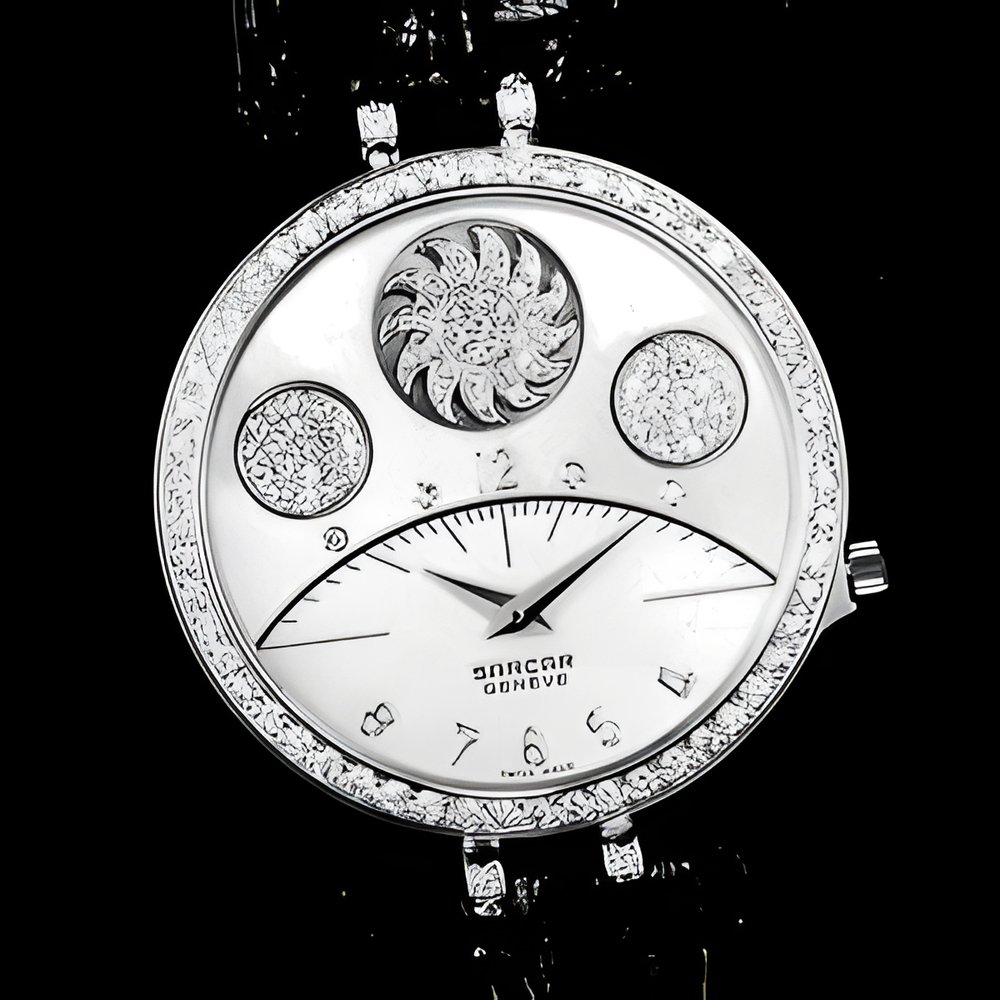 This Sarcar design comes to life with your every move. It features three mobiles that swing freely with each wrist gesture. In 18K yellow gold set with 134 diamonds (0.80 ct) and fitted with a black croco strap. (SARCAR)