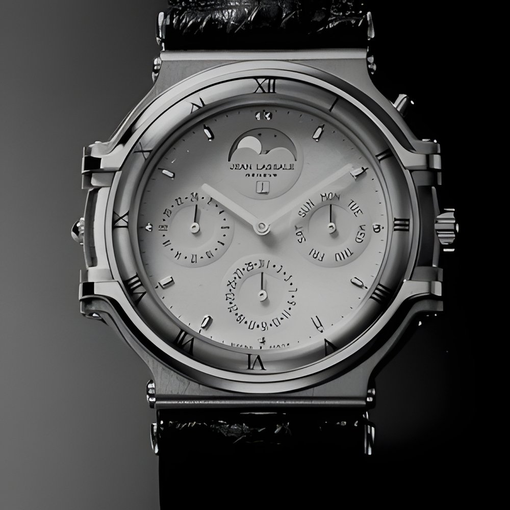 A new version, with leather strap, of Jean Lassale’s sports-spirited “Thalassa Five Star”. Its quartz movement provides the date, day, a second timezone and the phases of the moon along with the time. Waterresistant case in a choice of solid 18K gold, gold and steel or all-steel. With sapphire crystal. (JEAN LASSALE)