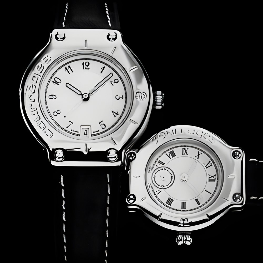 These new models in the “Courrges” sports watch line feature dials with Arab or Roman numerals, small seconds hand or calendar at 6 o’clock and a new version of the boldly styled case whose broad bezel carries the brand name. Goldplate and nickel-palladium finish, mineral crystal. Waterresistant down to 30 m, quartz movement. (ARODE DISTRIBUTION S.A., Geneva - “COURREGES”)