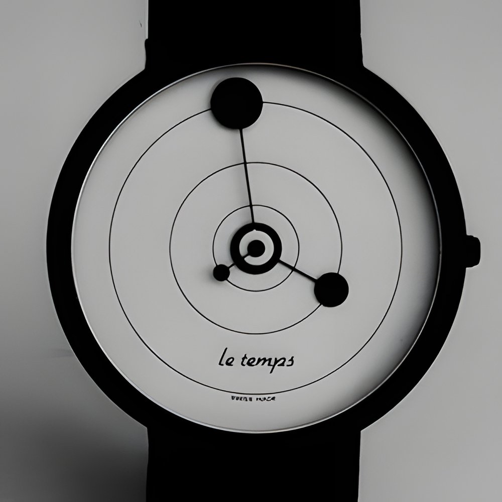 The hours, minutes and seconds each rotating on individual concentric rings give this generously proportioned (39 mm Ø) wristwatch its unusual, modern good looks. Steel-backed, water-resistant case with chromed, goldplated or black chrome finish. ETA Swiss Quartz movement. (NITELLA “Le Temps”)