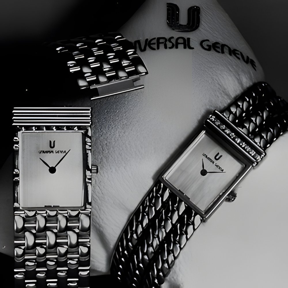 A shadow : your constant companion through Time. The 18K gold case protects a Swiss Quartz movement which is as thin as a shadow. The distinctive 18K gold bracelet is soldered to the case on one side and closes to the case on the other by means of a special safety buckle, which can be engraved with channels or set with diamonds. The rectangular mother-of-pearl dial is protected by a scratchproof crystal. Water-resistant to 30 m. (UNIVERSAL GENEVE “Golden Shadow III”)