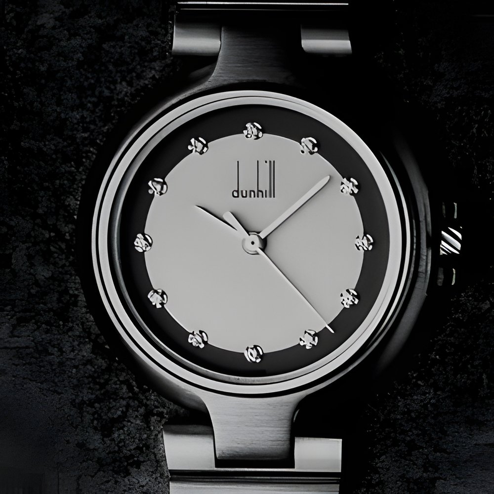 Watches from the Dunhill “Millennium” collection combine steel with gold plate and a variety of dial finishes. A new design for 1989 is the use of a two-tone grey enamel dial with diamond indices as shown above. (DUNHILL “Millennium”)