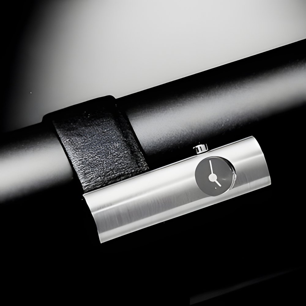 TIME goes further than two dimensions. Deployed in space, its presence assumes the three-dimensional reality of a CYLINDER. Quartz movement, water-resistant to 30 m, satin-finished steel or sterling silver 925, sapphire crystal, Bulgaro strap. Design : Paul Junod. (MILUS, Paul Junod S.A. - “Tribu”)