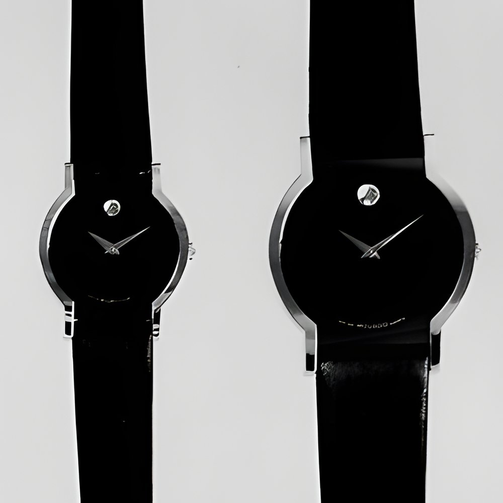 A superb example of how a classic model’s styling should be made to evolve. Movado’s Black Sapphire model features a redesigned case that in no way affects the dial’s unique, world-famed design. Black chromed steel case with solid gold, goldplated, black chromed steel or diamond-set gold rim, outcurved sapphire crystal. Quartz movement. (MOVADO “Nouvelle Black Sapphire”)