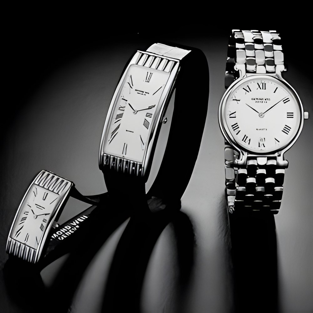 Left : classic-spirited yet original, this 18K goidpiated design displays an elongated, anatomically shaped case that hugs the wrist to perfection. Made in men’s and women’s versions, with a choice of dials : traditional Roman numerals or four quarters, gemstone riviere, zebra pattern... Quartz movement, mineral crystal, water-resistance guaranteed to 30 m. Black leather strap. Right : an understated design in 18K goldplate, with goldplated or two-tone integral bracelet. Roman numerals. Choice of dials, optionally set with gemstones. Quartz movement with date calendar, mineralglass crystal. Water-resistant down to 30 m. (RAYMOND WEIL)