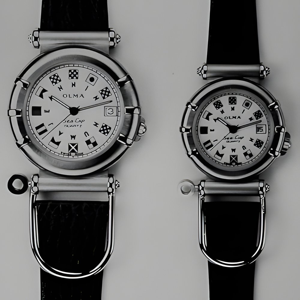 Presenting Numa Jeannin’s “Sea Cup”, designed specially for amateur sailors and owners of motor launches and sailboats alike. The shackle, found on every boat, is used as a decorative element. Choice of two dial faces. One uses the shackle bolt as an hour marker, the other signalling flags to spell the Numa 3eannin name. Stainless steel, two-tone, goldplated or vacuum-deposited titanium nitride-clad case. Water-resistant down to 30 m, mineral crystal, water-repellent leather. Dials can be customized with sailing club emblems. (NUMA JEANNIN “Sea Cup”)