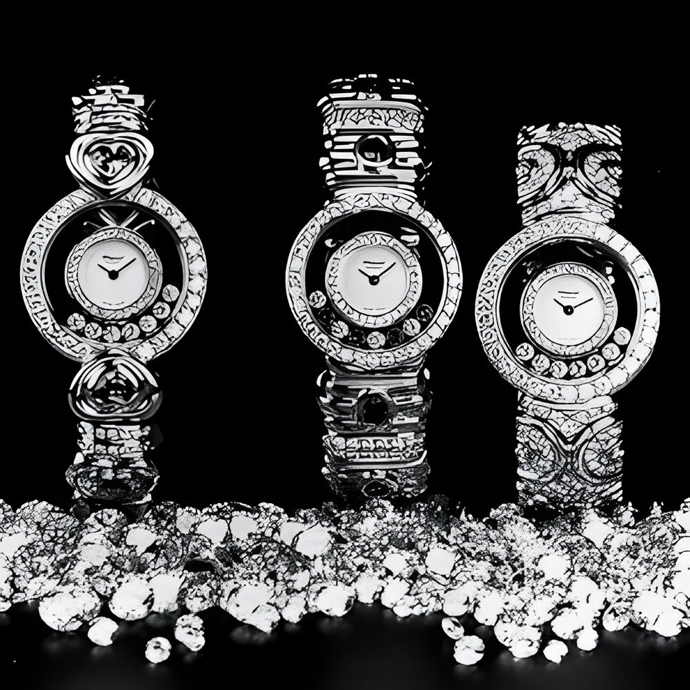 New entries in Chopard Genève’s “Happy Diamonds” collection, in 18K yellow gold, rigid bracelet and mini-quartz movement. From left, 20/5586 : case and bracelet set sith 146 diamonds (2.46 ct) and sapphire hearts (2 yellow, 2 blue and 2 pastel pink - 1.30 Ct), plus 7 loose diamonds. 20/5564 : case and bracelet set with 194 diamonds (4.19 ct), pink and pastel blue sapphire cabochons (1.90 Ct), plus 4 loose diamonds. 20/5563 bracelet and case set with 290 diamonds (7.07 Ct), plus 7 loose diamonds. (CHOPARD GENEVE)