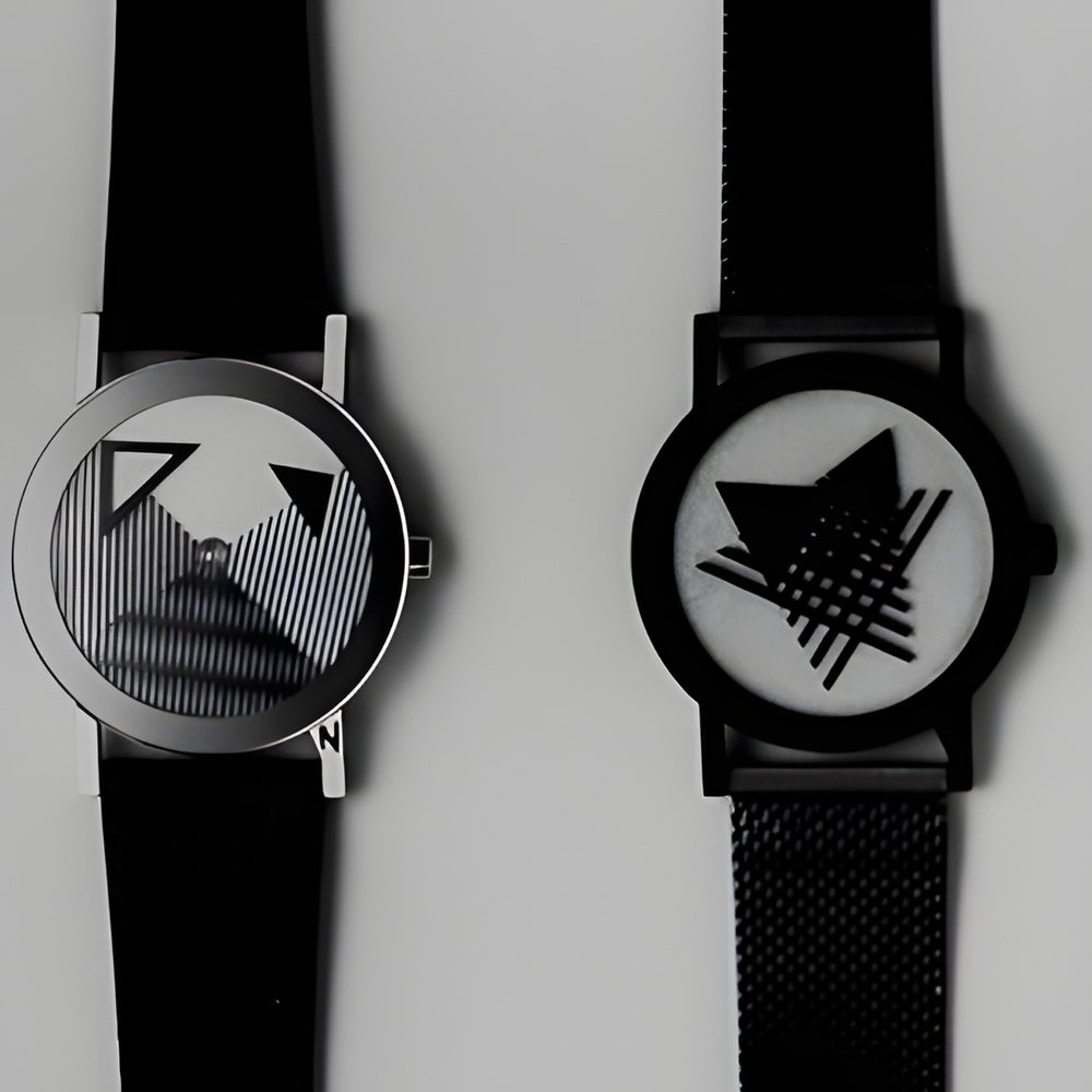 A novel approach to time display Inscribed on transparent discs, arrows or pyramids show the hours and minutes while combining into a variety of ever-changing geometric patterns. Cases and bracelets are in titanium-clad metal (leather straps are optional), with sapphire crystal. ETA Swiss Quartz movements. (TIMECO AG - NEWAGE)