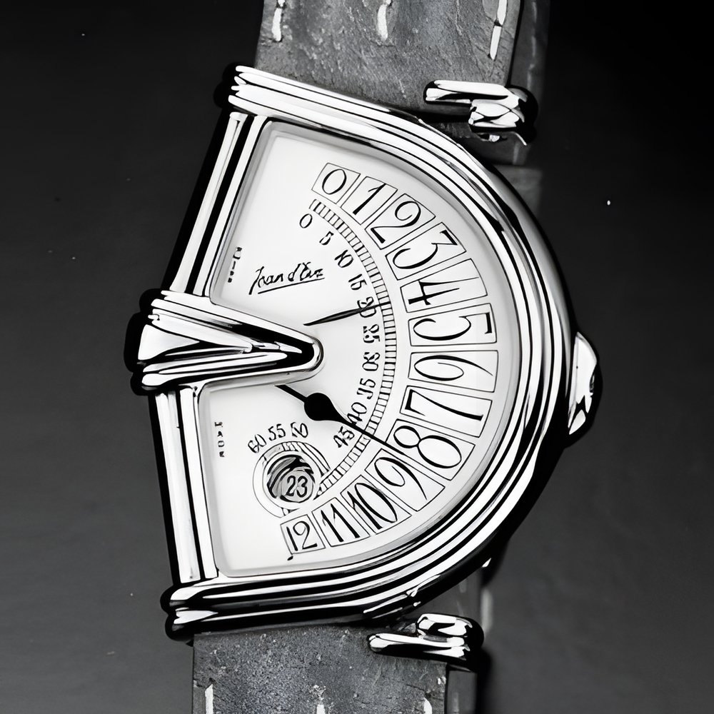 The most unusual of quartz watches again makes the news Fitting a calendar on a sectorial-time-display watch was no mean challenge - but successfully met by Jean d’Eve. And the results are handsome indeed : man’s model, here, with case in white or yellow goldplate or even solid 18K gold, with optional diamond decor. (LE PHARE-JEAN D’EVE “Sectora”)