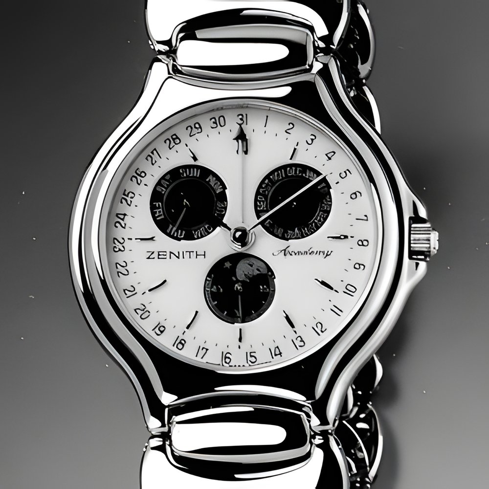 Zenith now adds a “complex” model to its Academy line. Its quartz movement provides hour, minute and second indications, plus the day, date, month and moon phases. Available in steel or with two-tone or yellow goldplate finish. Choice of metal bracelet or leather strap. Case waterresistant down to 30 m, with screw-lock crown and welded stem pipe. Scratch-resistant sapphire crystal. (ZENITH “Academy”)