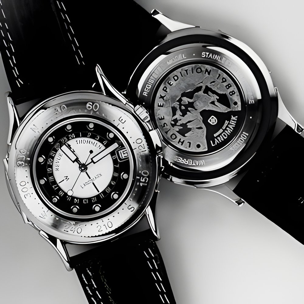 Designed specially for the Himalayan expedition of a team of mountain guides from Zermatt, this Revue Thommen sports watch includes a solar compass and a centre disc that makes one revolution every 24 hours. Steel case water-resistant down to 50 m, protective coverlid with rotating ring and mineral crystal. Tritium-paint luminous dial and hands. (REVUE THOMMEN “Landmark Sport”)