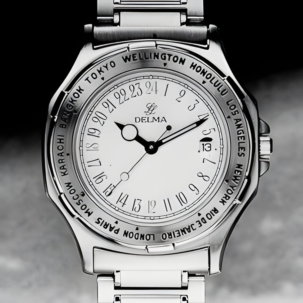 This special Delma design provides world time in a flash thanks to a dial with 24-hour divisions and a rotating bezel. To use, simply set the name of the city or timezone you’re in on the hour hand and the time everywhere else on earth will correspond to its place on the bezel in relation to the dial. All-steel, water-resistant case, protected crown, quartz movement with date calendar. Steel bracelet or leather strap. (DELMA “Les 24 Heures”)