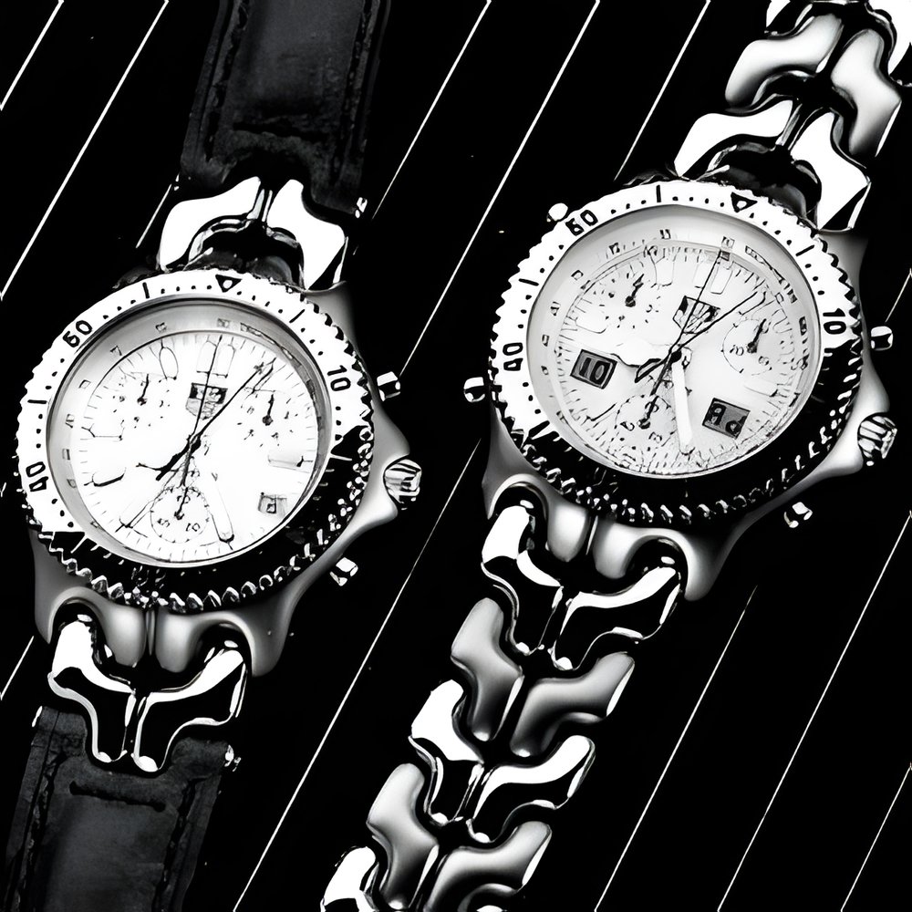 With the new movement of these chronographs, TAG Heuer, in collaboration with ETA, succeeded in taking a big step forward in the development of the art of watchmaking. The most performant quartz technologies united with the sporting elegant design of the S/EL collection make this highly qualified chronograph an indispensable instrument to compete in the race against time. There are two different movements. With 4-pushpieces: 1/100 of s, Start/Stop, Add, Split and Lap functions; 60s, 30 min and 12 h counters; memory for ’JO stopped times and the total time; tachymeter scale; quick correction of timezone; analogue display of hour and chronograph; two liquid crystal displays. With 2 pushpieces: 1/10 of s, Start/Stop, Add and Split functions; 1/10 of s, 60s and 12 counters; tachymeter scale; quick correction of timezone; analogue display of hour and chronograph. The two models are available with steel, two-tone steel bracelet or brown leather strap. (TAG HEUER)