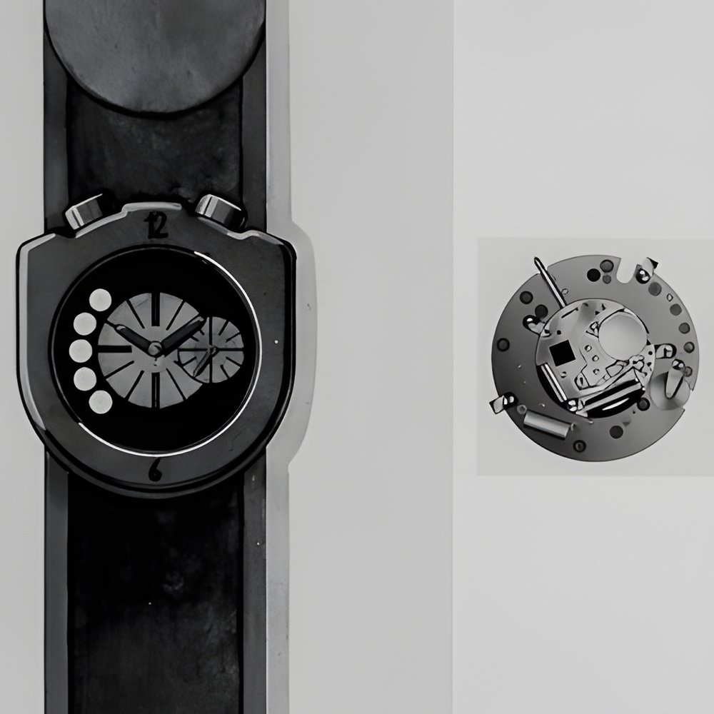 The “Memosurf” watch gives sailboard regatta enthusiasts a practical way of keeping track of the ten-minute countdown period preceding ragatta starts. The five discs gradually change colour and the last minute is also displayed on the 60-second timer at right. Pushpieces are located at 12 o’clock for better handling. The system is controlled by a bell-shaped, patented module that caps and rings a Harley Quartz 775 movement that runs independently of the rest. This solution yields considerable power-consumption savings and adds no less considerable slimness to the very youthspirited case. Displaying bright, fluorescent colours, its carbon fibre shell is water-resistant down to 100 m. (MEMOTIME “Memosurf”)