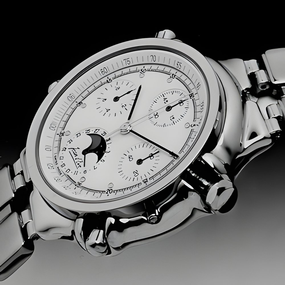 Sprightly, sports-spirited looks for this twin-movement chronograph. One provides traditional time of day while the other positioned around the first, controls the chronograph functions. At 9 o’clock on the dial, the hour totalizer also displays the 1/100th second during the first hour of timekeeping. Minute totalizer at 3 o’clock, date calendar with moon-phase indicator at 6 o’clock, tachymetric scale. Two-tone, water-resistant case. (LE PHARE - JEAN D’EVE “Pacific”)