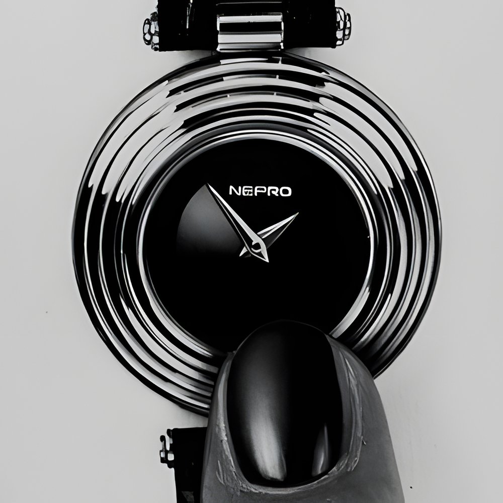 Nepro “Magic Touch” is the name of the system equipping the world’s first wristwatches featuring a time-setting system actioned directly by the watch crystal : simply press it and the hands advance. By doeing away with the winding or setting crown, the system opens the way to new design approaches and makes life easier for the lefthanded and handicapped, while ladies’ long manicured fingernails will no longer risk being chipped by a stubborn crown. (NEPRO “Magic Touch”)
