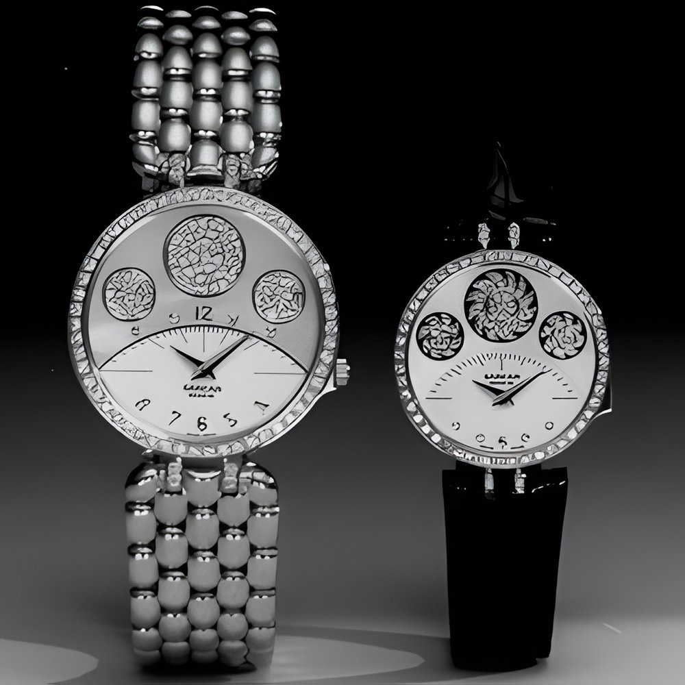 This His and Hers pair from Sarcar features three diamond-set mobiles that oscillate freely with every movement. Cases in 18K yellow gold. Mobiles and cases are set with 117 diamonds for the woman’s and 140 diamonds for the man’s model. Gold bracelet or black crocodile strap. Quartz movements. (SARCAR)